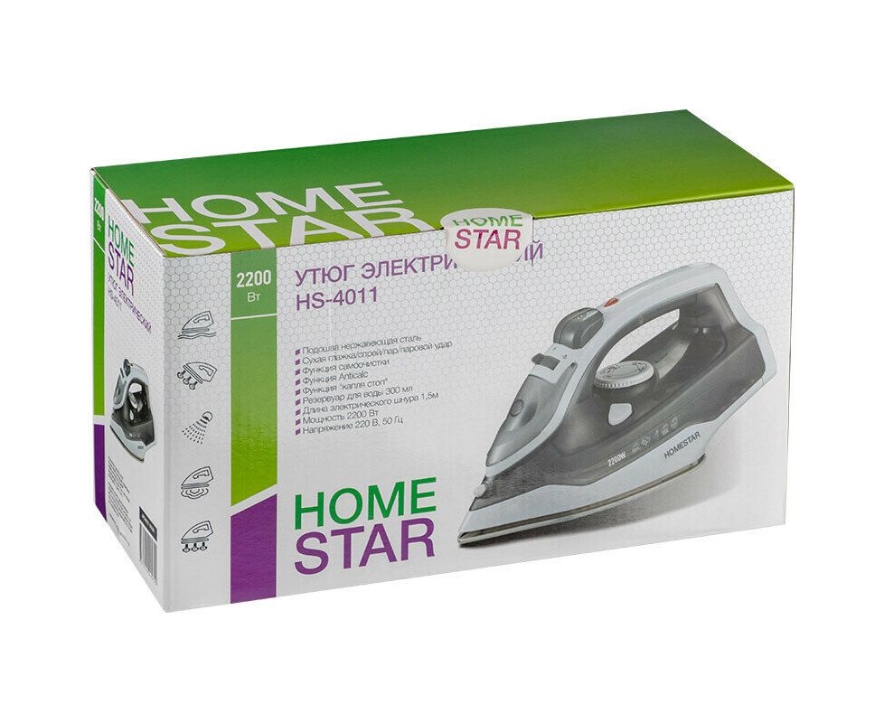 Утюг Homestar hs-4011 серый 2200 Вт, пар, подошва нержавеющая сталь, антинакипь, капля стоп 105381 предназначен для глажения белья, домашнего текстиля, одежды.