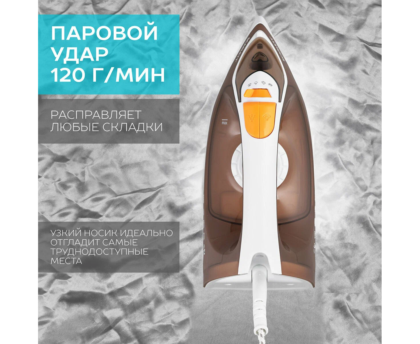 Утюг Scarlett SC-SI30K47, выполненный в коричневом цвете, оснащён подошвой с керамическим покрытием KeramoPro, которая обеспечивает отличное скольжение и бережное отношение ко всем видам тканей. Максимальная мощность 2200 Вт позволит в считанные минуты справиться даже с тканями со сложной фактурой, а различные температурные режимы помогут выбрать оптимальный для того, чтобы самые деликатные ткани выглядели после глажения идеально. В режиме парового удара создает 120 грамм пара в минуту, расправляя даже самые непослушные складки. Функция вертикального отпаривания позволяет привести вещи в безупречный вид, не снимая их с вешалки. Легко ухаживать за утюгом позволит функция самоочистки, а система ANTI-CALC защитит от накипи и продлит срок его службы. Оптимальный вес способствует разглаживанию неровностей без излишней нагрузки на руки, а узкий носик позволяет идеально отгладить даже самые труднодоступные места.