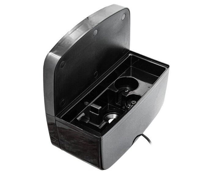 Система управления — электронная, интенсивность регулируется с помощью сенсорной панели, предусмотрена индикация выбранной мощности. Если в резервуаре нет воды, устройство отключится автоматически. Корпус сделан из пластика и для лучшей устойчивости дополнен прорезиненными ножками. Размеры — 26,2х25,8х14,2 см, вес — 1,64 кг.