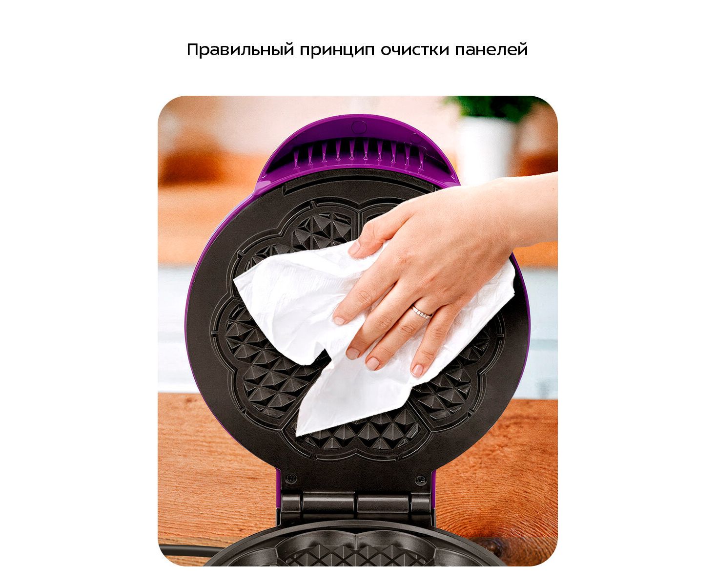 Очищайте панели бумажными полотенцами, удаляя остатки теста. Затем протрите мягкой влажной тканью. При сильных загрязнениях используйте немного мягкого моющего средства. Избегайте абразивных средств, чтобы не повредить антипригарное покрытие.