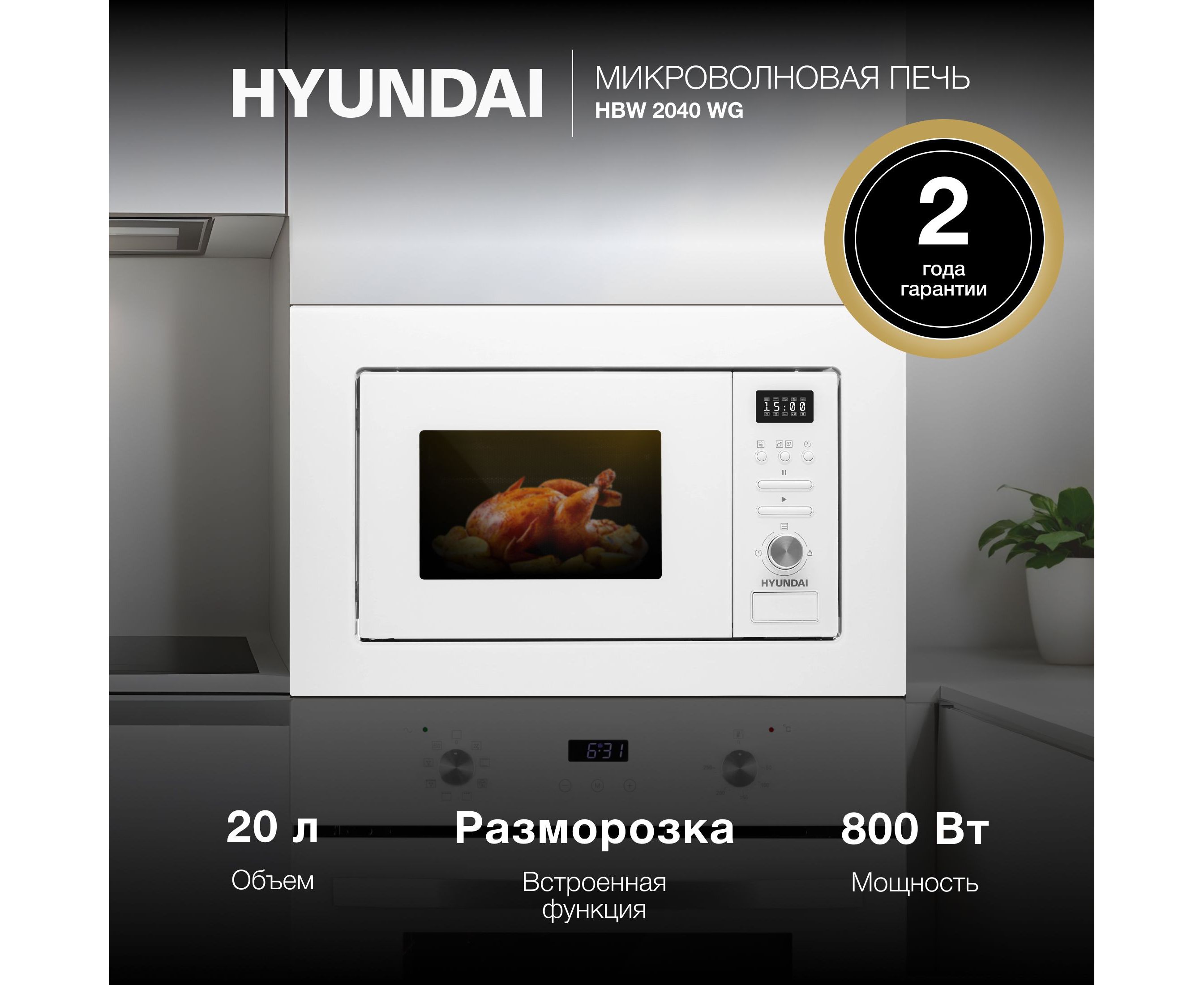 Встраиваемая икроволновая печь Hyundai HBW 2544 WG белый