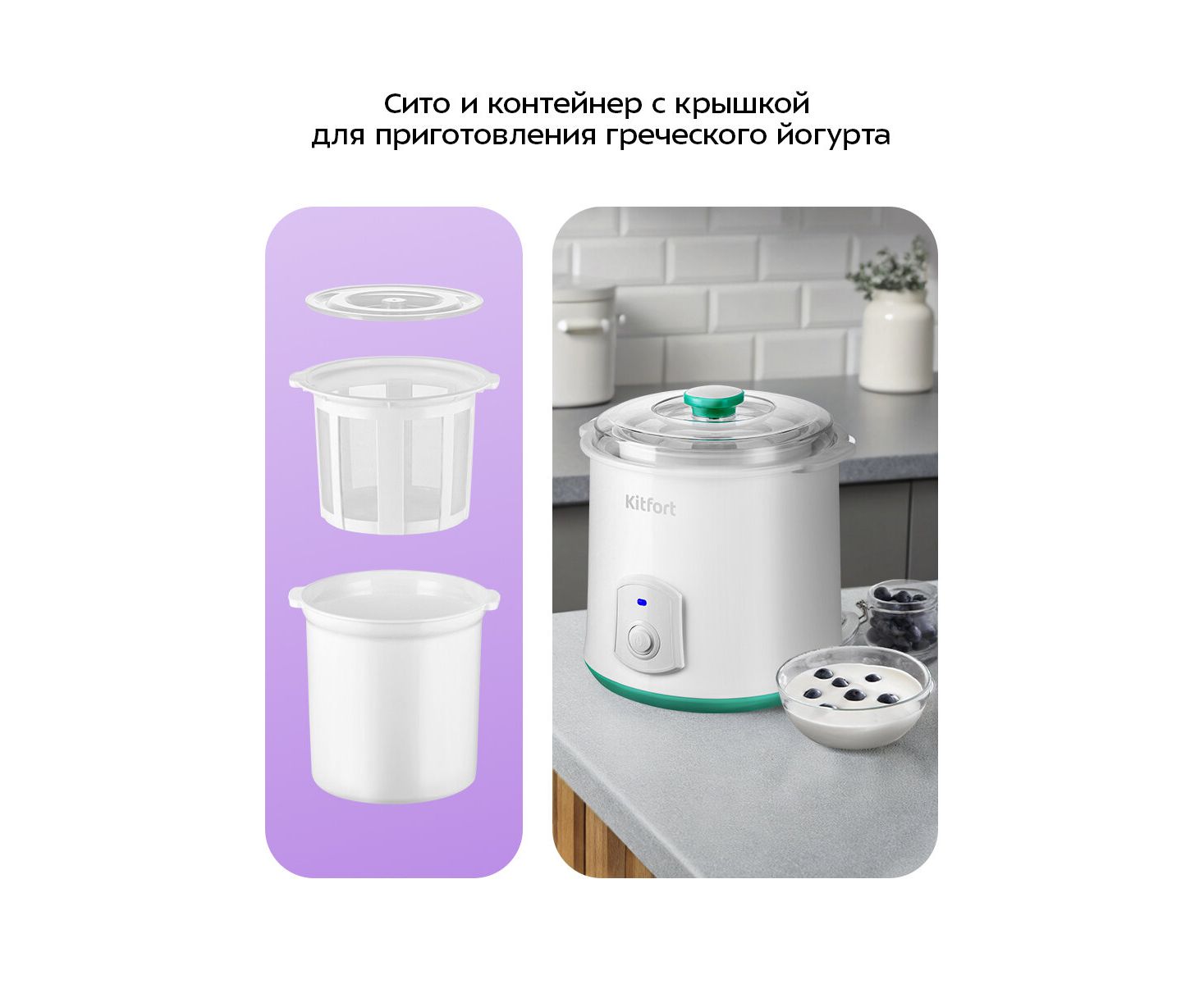 Сито и контейнер с крышкой используются для слива сыворотки при приготовлении греческого йогурта. Греческий йогурт имеет исключительные диетические свойства и прекрасный вкус. Он гуще и плотнее обычного йогурта.