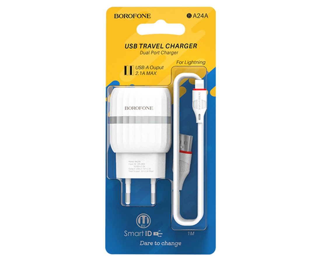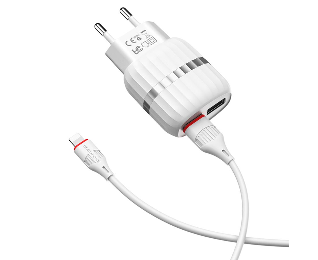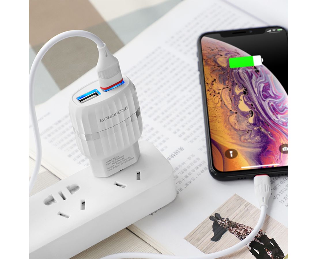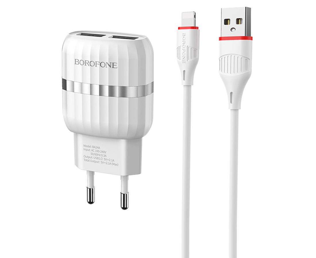 Сетевое зарядное устройство BOROFONE BA24A Vigour 2xUSB с Кабелем USB - Lightning, 2.4A, белый