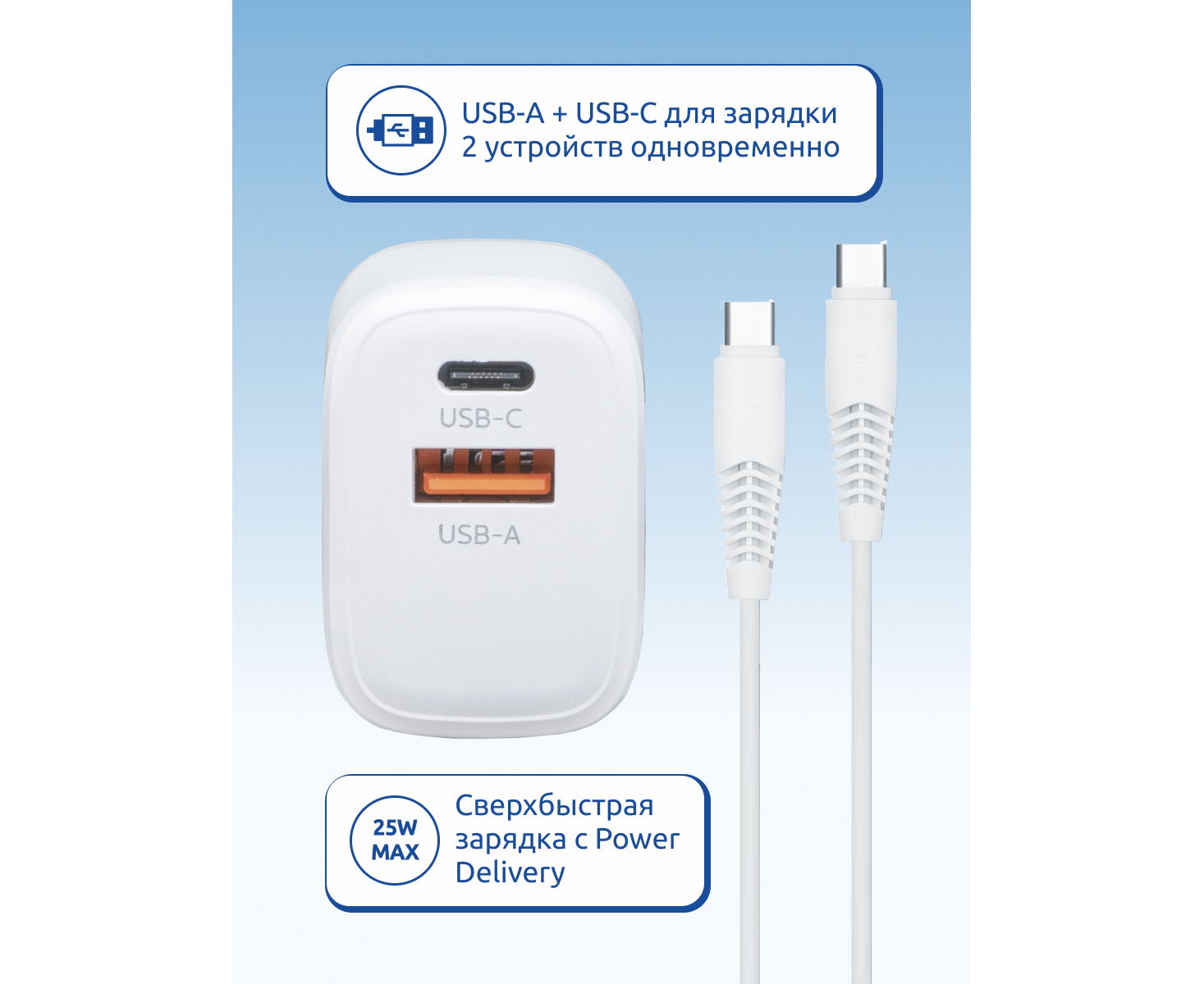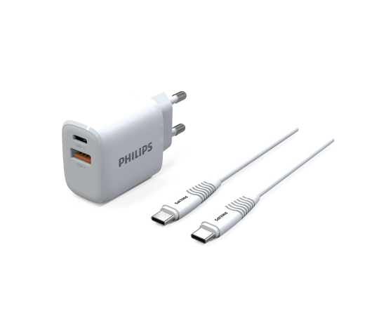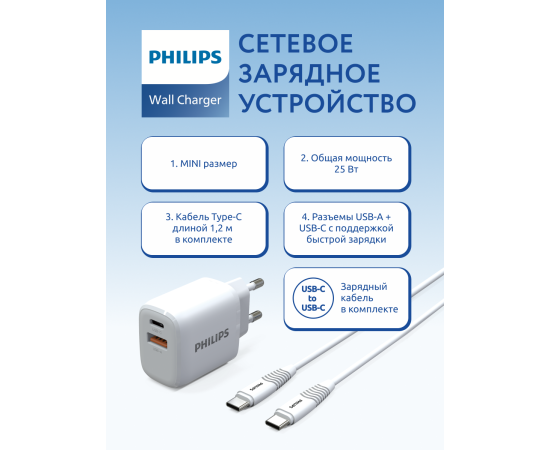 Зарядное устройство для телефона Philips DLP2560DW/97 Travel, USB-C и USB-A, 25W, кабель Type-C Type-C, быстрая зарядка QC3.0, белый