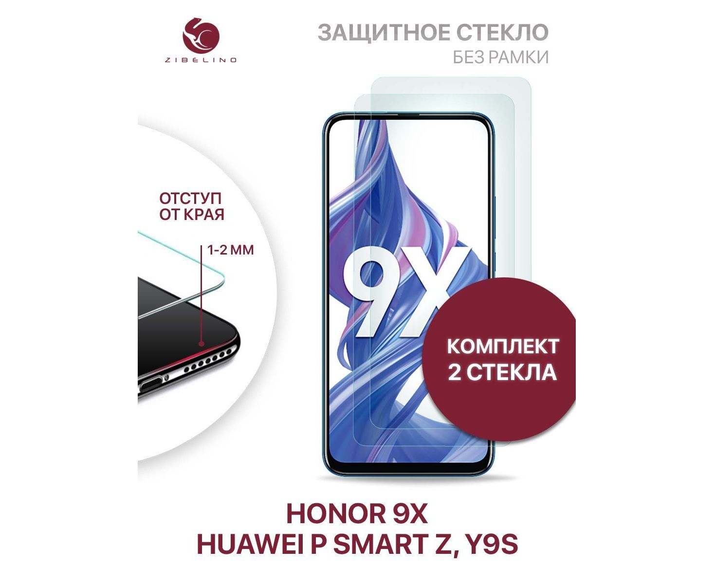 Защитное стекло (Комплект 2 шт) для Honor 9X, Huawei P Smart Z, Huawei Y9S без рамки, с отступом от краев, Хонор 9Х Хуавей Р Смарт Z У9S